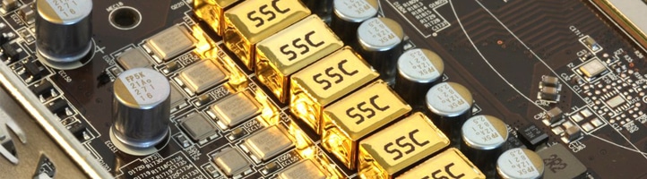 Here we see the layout and highlights of the Military Class components, starting with the gold caps, which add a nice, shiny appearance to the card as well. The CopperMOS is something we have seen before in high performance VRM’s. The absence of the composite capsule around it definitely helps it stay cooler and overall performance has been good from our experience previously. The solid state caps are a dark color for appearance’s sake, but their totally solid state nature means better overall reliability and working stability as well.