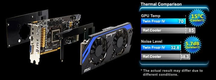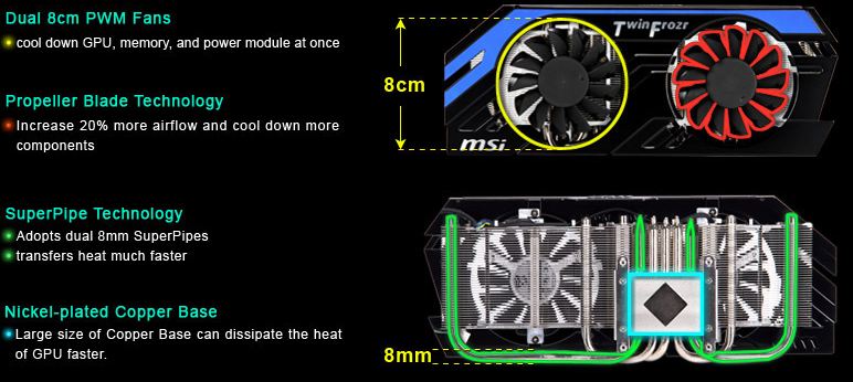MSI introduced the Twin Frozr cooler quite some time ago. The Twin Frozr is MSI’s version of the custom cooler to keep the GPU and components cool on the card.