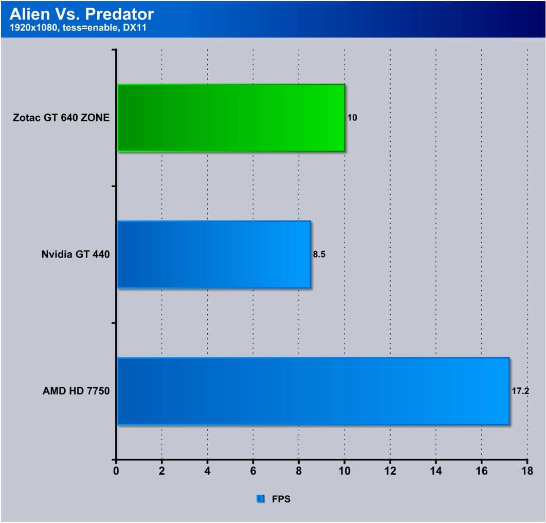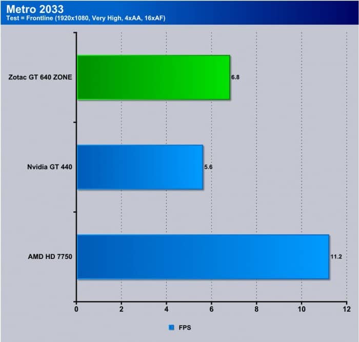 Metro 2033 is ridiculously stressful, but we ran a few loops to see how the 640 ZONE fared. Unsurprisingly, the game was not playable, though at these settings, the game is not playable on many GTX 580’s either.