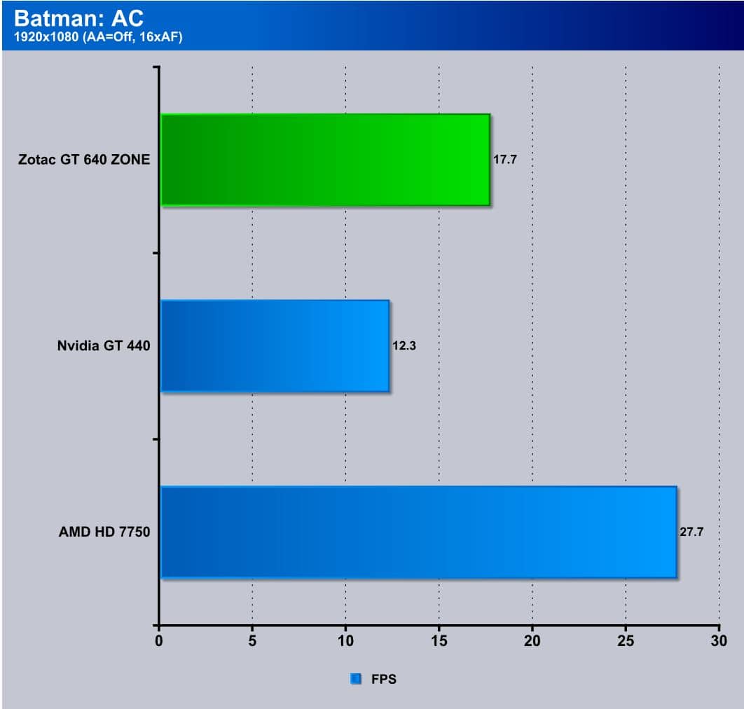 Batman Arkham City is a fun game, and to our surprise, in HD resolutions it actually looks like it could hit maintainable frame rates as long as we turn down graphics quite a bit.