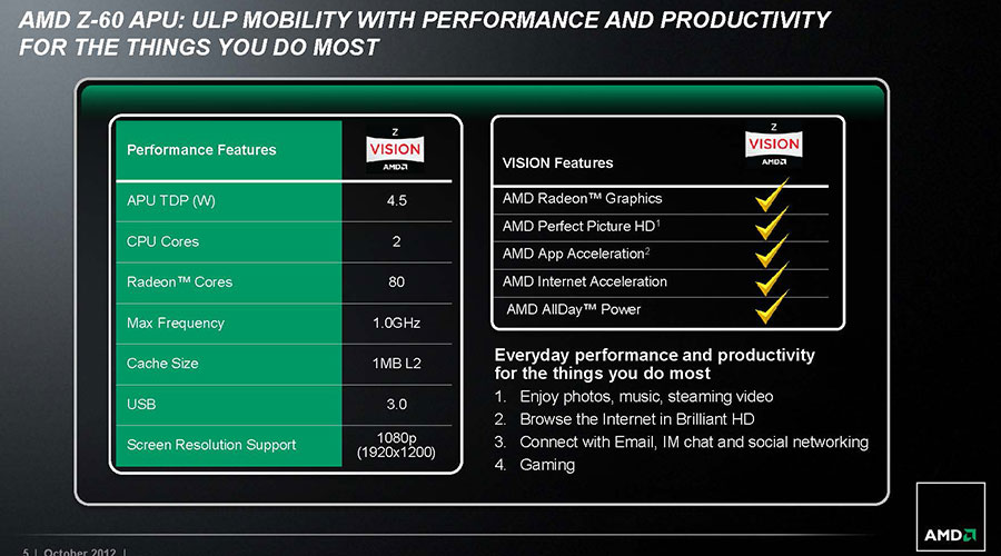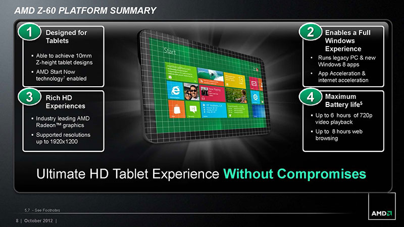 AMD brings Z-60 APU for Windows 8 tablets with promise for better HD Media playback, enhanced gaming, and performance accelerated Apps. The APU promises to bring up to 10 hours of battery life, native USB 3.0 and SATA 6 Gbps support.