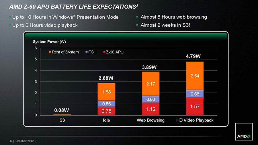 AMD wants to bring the attention to the battery life with system running the Z-60 APU. According to AMD, the system is able to last almost 2 weeks in S3 standby mode. Idle, the system has a rated of 2.88W power consumption, and in web browsing, it consumes 3.89W; while during HD video playback, 5W of power is being used. AMD quotes the system lasts almost 8 hours in web browsing and 6 hours in HD video playback. The number sure looks impressive, however, digging into the test setup, we noticed that the quoted battery life is tested with a 30Whr batery pack with the screen set at 60 nits at 720p resolution. While there is no standard at rating battery life (we do hope there is one) across the industry, the 60 nit brightness maybe a tad low for average user.