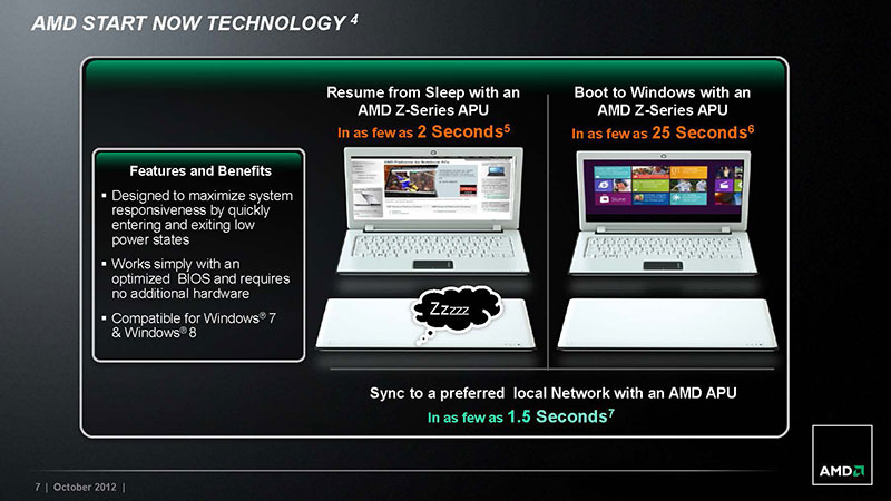 During the press release meeting, AMD highlights the company’s push for the faster resume time with its “Start Now” technology. Combining the APU with an optimized BIOS, the APU is able to resume from sleep in as few as 2 seconds and boot to Windows in as few as 25 seconds. Obviously, the test is done with an SSD (Intel 510 SSD as a matter of fact) and Windows 8.