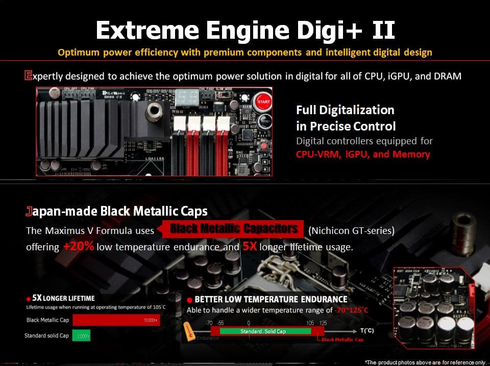 The Digi+ solutions have been a mainstay on ASUS boards for some time now. For the ROG models the Extreme engine Digi+ solutions are selected from very top components to ensure overclockability and constant load performance is never a matter of compromise. We have covered the Extreme Engine Digi+ components many times previously and the same carries over with full digital Digi+ controllers, solid state black Nichicon GT caps and top shelf mosfet components.