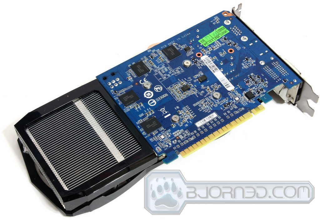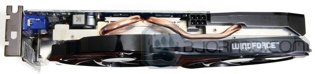 Taking a closer look at the card’s design, we can see that the video card has 4 additional memory modules attached on the back of the PCB. This is obviously not available on the 1GB versions of the card, as those memory modules were left out on purpose to save on cost. We can also see that there is no SLI support on this video card. Unfortunately, this was a decision that Nvidia made, and GIGABYTE cannot really change the design of the card, since the GTX 650 Ti was not designed to be run in SLI. From these angles, we can also get a bit more understanding of the cooler on this video card. We can see the actual PCB size is much smaller, which is why the 6-Pin PCI-E power connector on this card is located almost towards the middle of the card. The cooler comes with two copper heatpipes that go straight to the GPU to have direct contact with it. These heatpipes spread the heat across many aluminum fins which then the two fans cool down to cool the processor. However, one thing to notice is that the cooler does not actually touch the memory modules on the card. This means that only the GPU will be cooled by the heatsink, and the memory modules will only be cooled by the airflow being blown through the card.