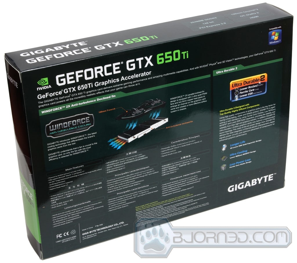 The front of the GIGABYTE GTX 650 Ti OC 2GB video card makes a clear difference between the 1GB and 2GB version of the card available on the market. The front package also shows off the windforce design cooler and that the card is overclocked. The back of the box takes a look at some of the specifications of the cooler and the video card, and also talks about the Ultra Durable 2 components that users will find used on this particular video card.