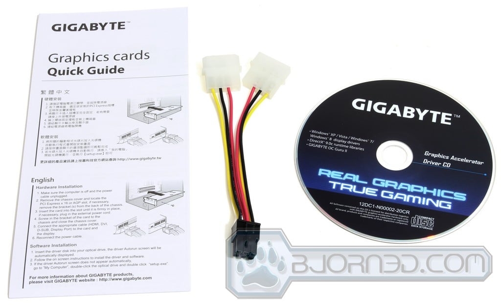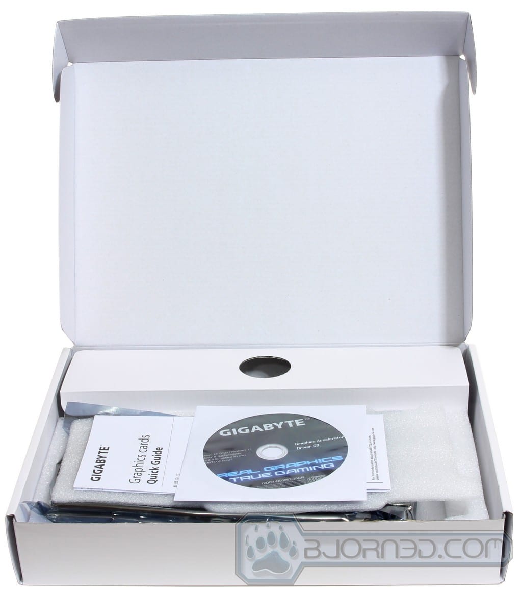 Inside the box you’ll find some accessories and the actual card. As we can see, the card is protected by air pockets, which means that if the box takes a direct a hit, the air pockets created inside the packaging will protect the card from getting damaged. Unfortunately, not many accessories are given with the card. Probably not a big issue and we’ll explain why. While we are expected to see some display output adapters, it is not a necessity with this particular card. Other cards like the MSI GeForce GTX 650 Ti Power Edition came with the adapters due to having a mini-HDMI port and for not having a D-Sub/VGA port. The GIGABYTE GeForce GTX 650 Ti OC 2GB card comes with both of these display outputs already, which means that no adapters are required and the same outputs will be available to the user. The included accessories are: a Quick Installation guide, a PWM to 6-Pin PCI-E power connector adapter, and a Driver CD.