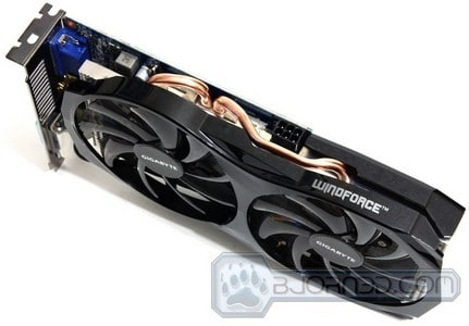 If you are familiar with GIGABYTE’s windforce cooler design, then it should be nothing new to you. The card comes with a dual-fan design, which should help provide a much quieter cooling over a single fan design card. The reason being is because GIGABYTE is able to achieve the same or better cooling potential by running to lower RPM fans, reducing air and motor noise over the single fan cards that might require to use higher RPMs to get the same cooling done. The cooler design is not too appealing to us, however, we’ll check out how this cooler design actually works when it comes to testing the card.