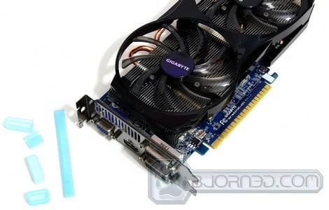 As we might have seen from previous pictures, the GIGABYTE GTX 650 Ti OC 2GB video card comes with small plastic rubber covers that protect all the connectors on the card, including the PCI-Express slot connector, and the display output connectors in the back. This is a nice feature, because you can be sure that nothing has scratched the main PCI-E connector golden fingers or no dust has entered the display ports. These are very cheap additions to the card that should not change the overall price of the card, but will give more overall quality to the user.