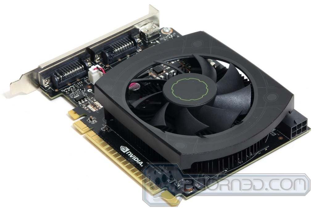 The card we have received did not come in any specific packaging, because we’ll most likely only see these cards from specific manufacturers, like MSI, GIGABYTE, ASUS, etc.. This is a very small card. It would not necessarily work in a low-profile system, but we’re sure such cards might be available from other manufacturers. The card comes in at the length of the PCI-Express slot, which means that if you have a slot available in your system, it should fit without any problems, no matter of the size of the case, as motherboards are usually way longer than the length of the PCI-Express slot. The card will still use two available expansion slots due to its dual-slot cooler design, but because the cooler does not extend to the back of the expansion slot, additional accessory can be installed in the available expansion slot. The cooler on the GPU is a simple heatsink with a fan on top of it. According to our tests, the noise level coming from the fan is almost inaudible, making this card very quiet even during gameplay. This card does need one 6-Pin PCI-E power connector, and at least a 400W Power Supply. Lower wattage power supplies should still work as long as efficiency is ideal, and the power supply is certified for higher-output graphics cards.