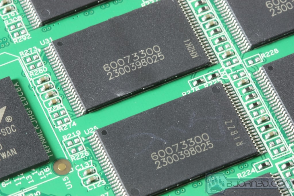 Here we get a look inside. We can see right off the bat the 16 total (8 front/8 rear) mysterious NAND chips. These NAND chips had no discernible markings that I have seen before as they simply have a alphanumeric combination that I have yet to figure out as there are no actual logos or indicator of who produced these NAND ICs. Also there is the SF2281 chipset which is found on many drives I have used to date.