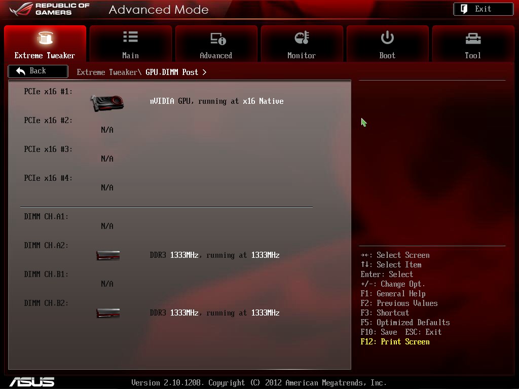 GPU/DIMM POST is one of those features whose benefit usually will be seen in the most stressful times like when something is not working. We actually wound up using this feature without intention on a previous ROG review, when a 32GB memory kit we were testing only showed up as 24GB. As we entered the BIOS after several attempts to fix the problem, we checked the GPU/DIMM POST and found that 2 modules were reading as “abnormal”. Powering the system off and resetting those DIMMs remedied the issue, but seeing that info directly in the firmware can save a lot of time when diagnosing errant behavior or instability; this kind of information being readily available is an invaluable asset to users. Additionally, the GPU POST option allows us to see the installed GPU’s in each slot, so that when benching LN2 or even on a liquid cooled gaming rig, the GPU POST screen can be checked to ensure identification of all installed cards is accomplished. See the BIOS Section for more info.