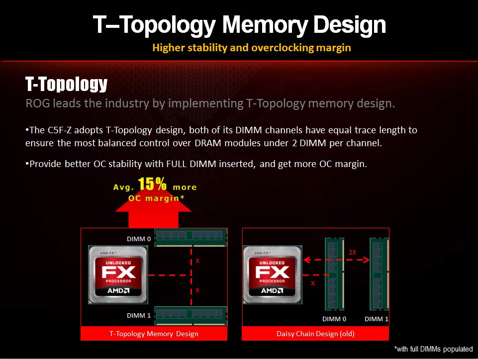 The T-Topology design allows for equal length traces to the DIMM slots so that signals should in a sense be matched instead of the older designs where trace lengths could be slightly different causing signaling mis matches and this kind of thing could limit memory clocks when really pushing for the upper limit.