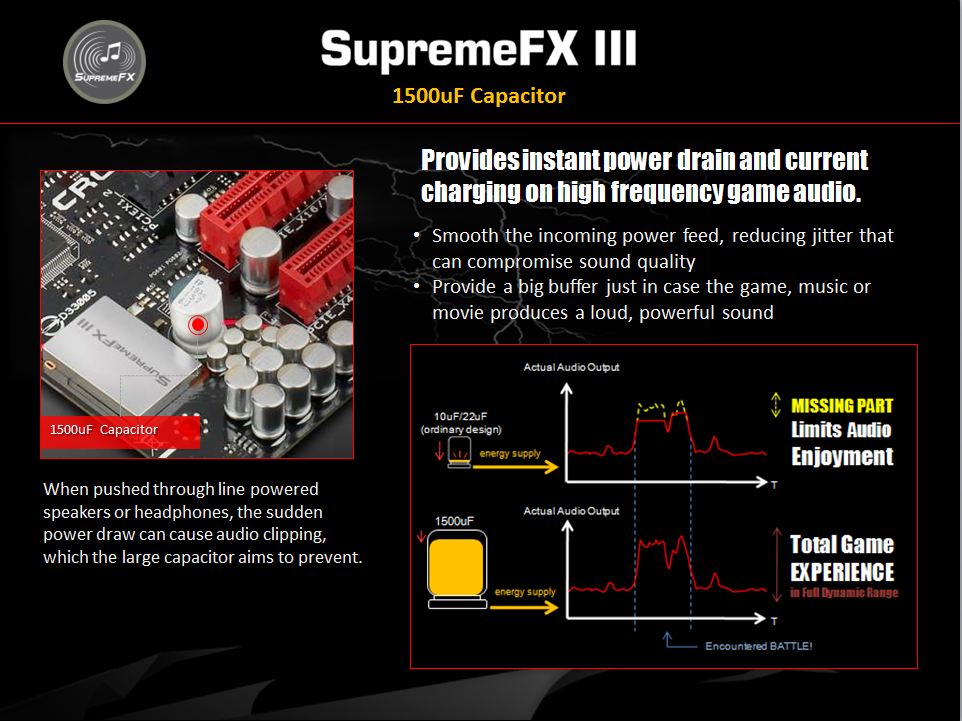 Top quality caps are used in the SupremeFX III audio solution to allow for the cleanest possible audio from the onboard solution. These are all solid state caps on the separated island ensuring excellent and clean audio is all that reaches your speakers or gaming headset.