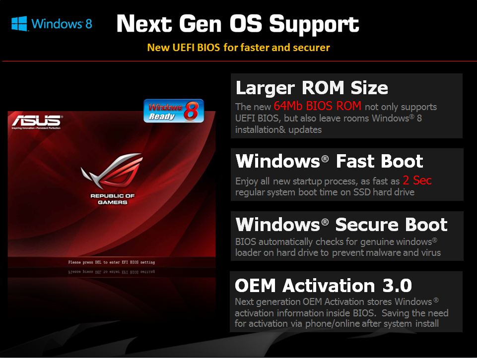 ASUS has been hard at work prepping for Windows 8, the new revolutionary OS from Microsoft. With this comes a new BIOS CAP file which is said to improve features and functionality integration for better compatibility with the new OS. Other cool features include faster boot up times and optimized settings for a smoother Windows 8 working environment. We’re sure the features available for this upgrade will scale larger as the OS matures and becomes available so keep a lookout at the ASUS site for updates found HERE