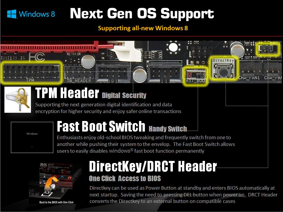 Other features not necessarily seen as plugs or interfaces on the board are seen above. This is all based around implementing Windows 8 for better performance, security and even smoother integration.