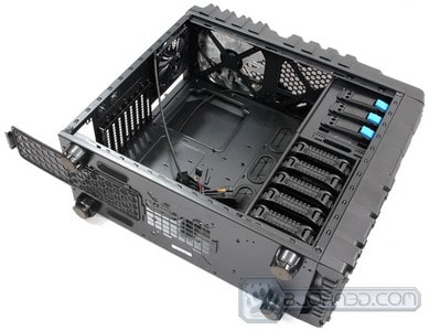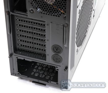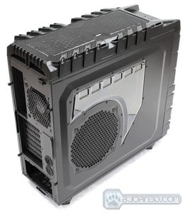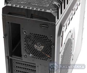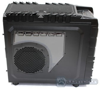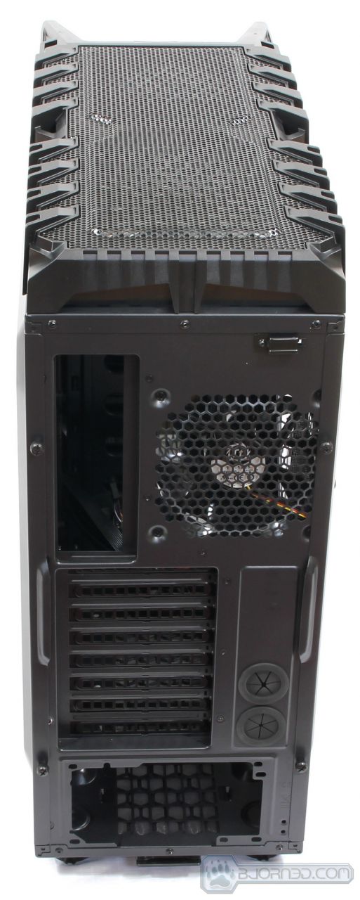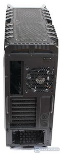Now we can talk about the details of the back of the chassis. There are a total of 8 expansion slots. This can make it difficult to run 4-Way SLI or CrossFireX configurations in this chassis, unless the specific motherboard used supports such expansion slot configuration. 3-Way SLI or CrossFireX should not be a problem at all. There are two large 1/2″ water cooling loop grommets installed in the back allowing the user to install external water cooling loops even with the 1/2″ tubing. The Power Supply mounts on the bottom of the chassis, allowing the power supply to suck cool air in from the bottom of the chassis. Not to worry, as the bottom of the chassis comes with a fan filter that will prevent dust from being sucked in. It is a great possibility that little specs of dust still get through, however, its is 10X better than not having anything. The top of the chassis comes with a 120mm fan. The top fan filter doesn’t slide out like on the Cooler Master Storm Stryker or Storm Trooper chassis, which makes cleaning the filter harder, as it is attached to the top plastic cover. Removal of the top plastic cover might be necessary.