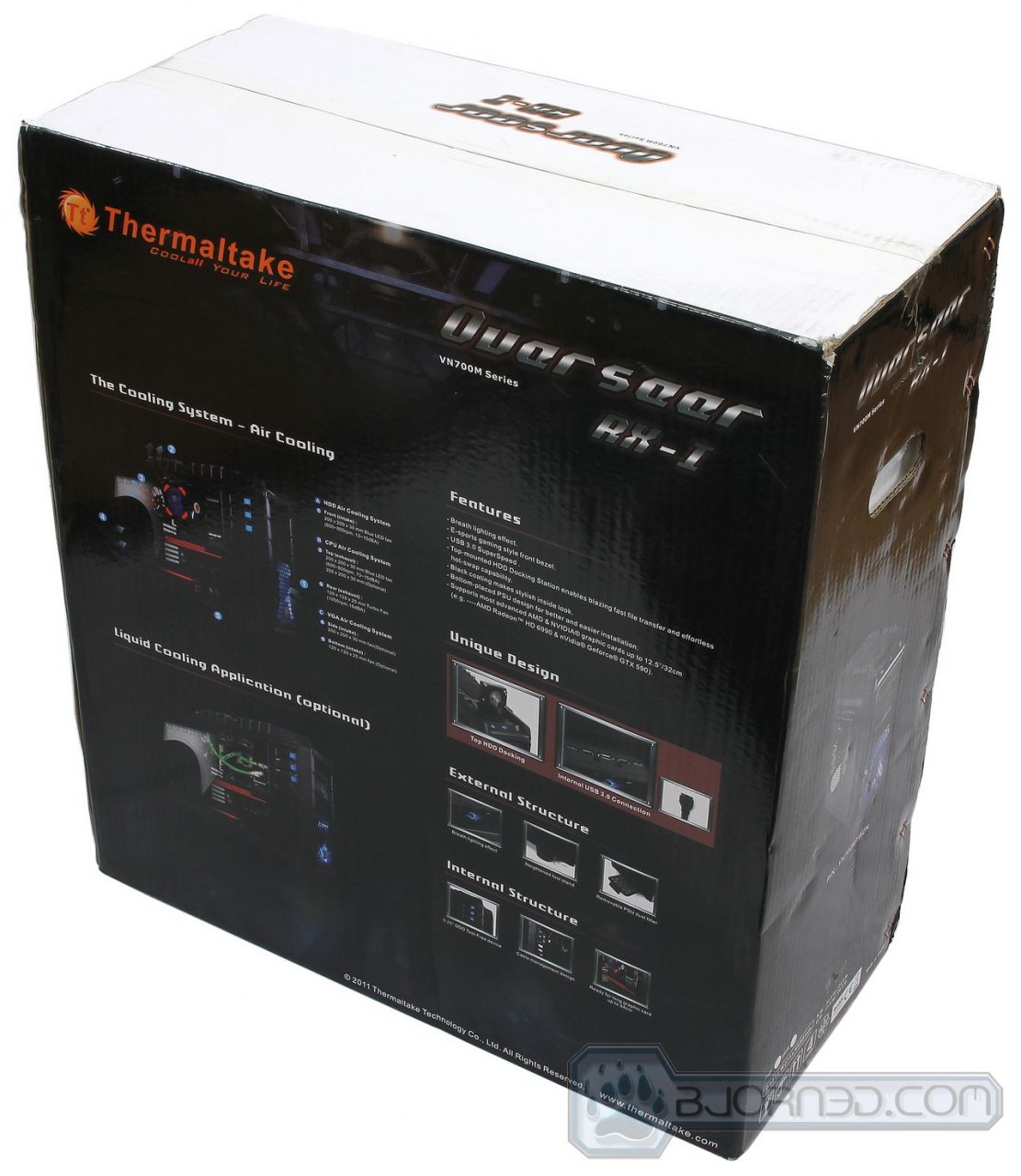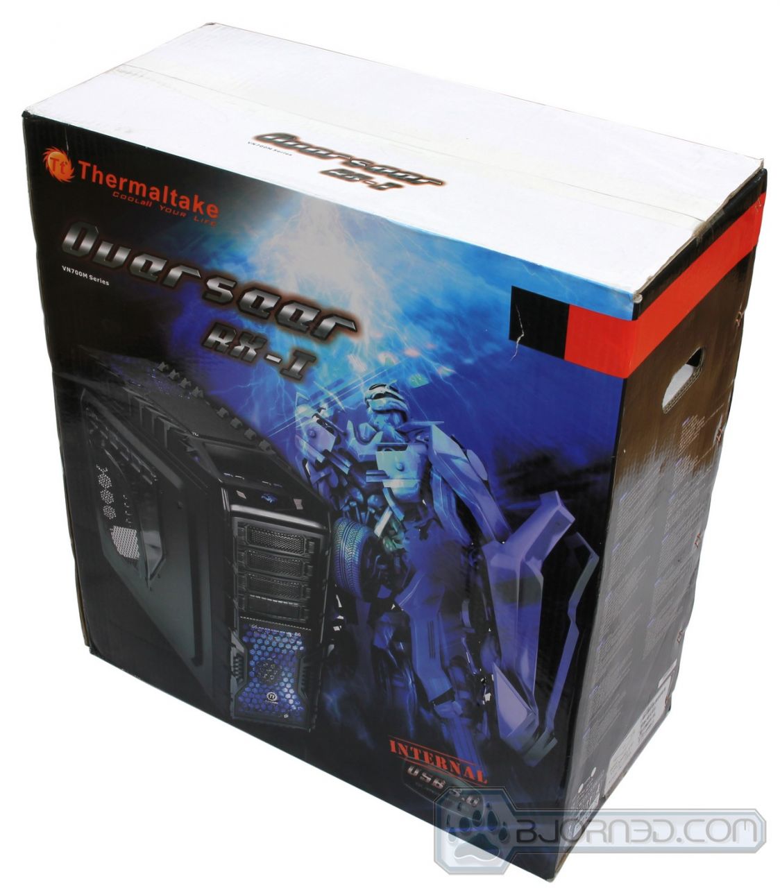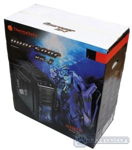 We have taken a look at a few Thermaltake chassis in the past, and they all come in a very sturdy cardboard box that requires quite a bit of banging to actually damage the product inside it. The Overseer RX-I is no exception. It comes in a fairly big blue and black themed chassis that resemble the LED fan colors with a Transformer type robot on it’s front with the Overseer RX-I. The back shows off some of the key features of the chassis, like the internal USB 3.0 connector, the fan filters, the tool-less drive installation, etc. The side of the packaging includes more specifications about the product.