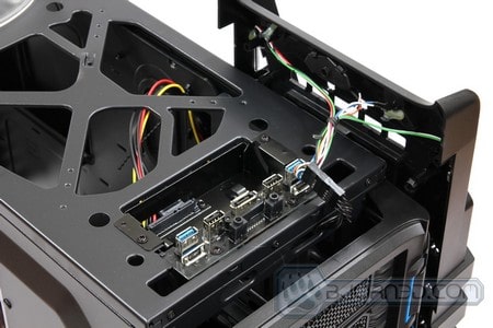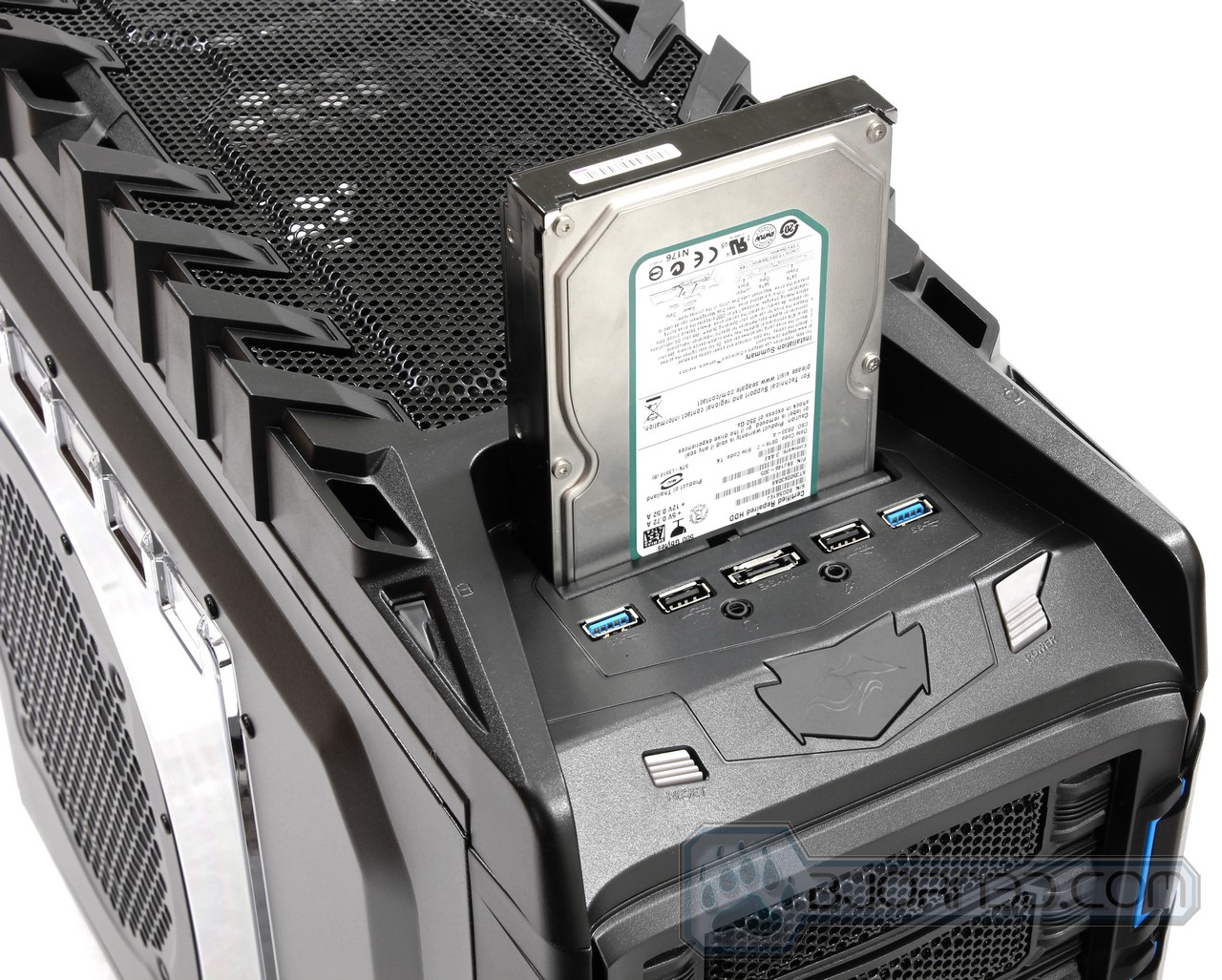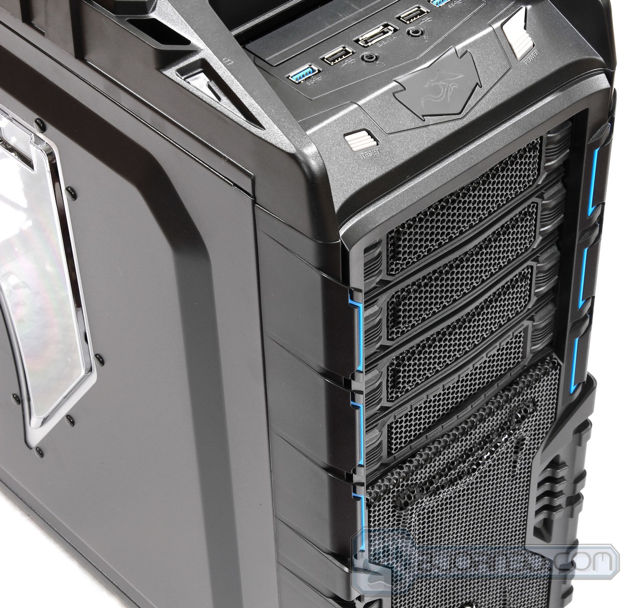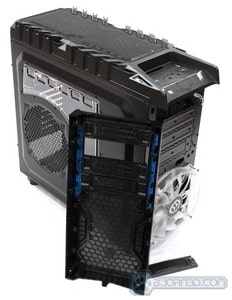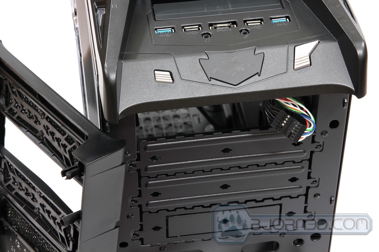 Moving on, a closer look at the top front of the Overseer RX-I, we are presented with a external 3.25″ drive bay. This drive bay also comes with a pre cut 2.5″ hole to allow for SSD installation also. This is a great way of keeping a backup of your files on a Hard Drive or SSD, if you do not plan on installing your hard drive or SSD in an external storage backup enclosure. The front also comes with two USB 3.0 connectors, which come with internal USB 3.0 connector, two USB 2.0 connectors, one eSATA connector, one headphone jack, and one microphone jack. The front emblem like design lights up when the system is running with the Overseer RX-I logo. Finally you have a Reset button on the left and a Power button on the right.