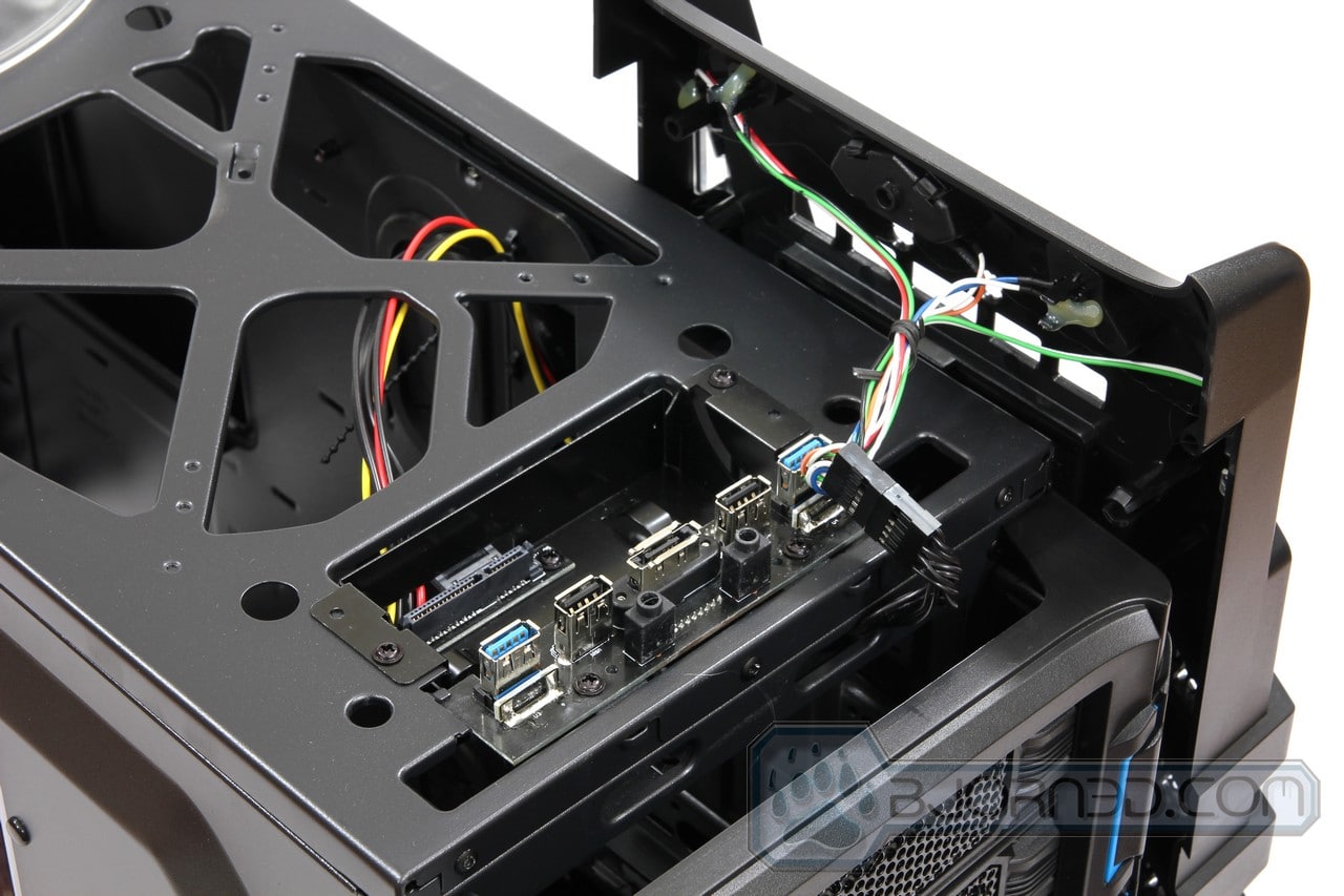 Removing the front panel is as simple as just pulling on it. No need to go inside the case and unlatch the sides to take the front off. This is great because installation of hardware and switching out fans becomes easy. The old way of doing it was just too much hassle. Once the front panel is off, we can see that the top 5.25″ drive bay cover has been automatically removed. This is designated for your DVD or Blu-Ray player, but you’re not limited to only that slot. The cable sticking out from the drive bay is the cable that connects top accessory ports. Those cables eventually get plugged into your motherboard so the top connectors would become usable.