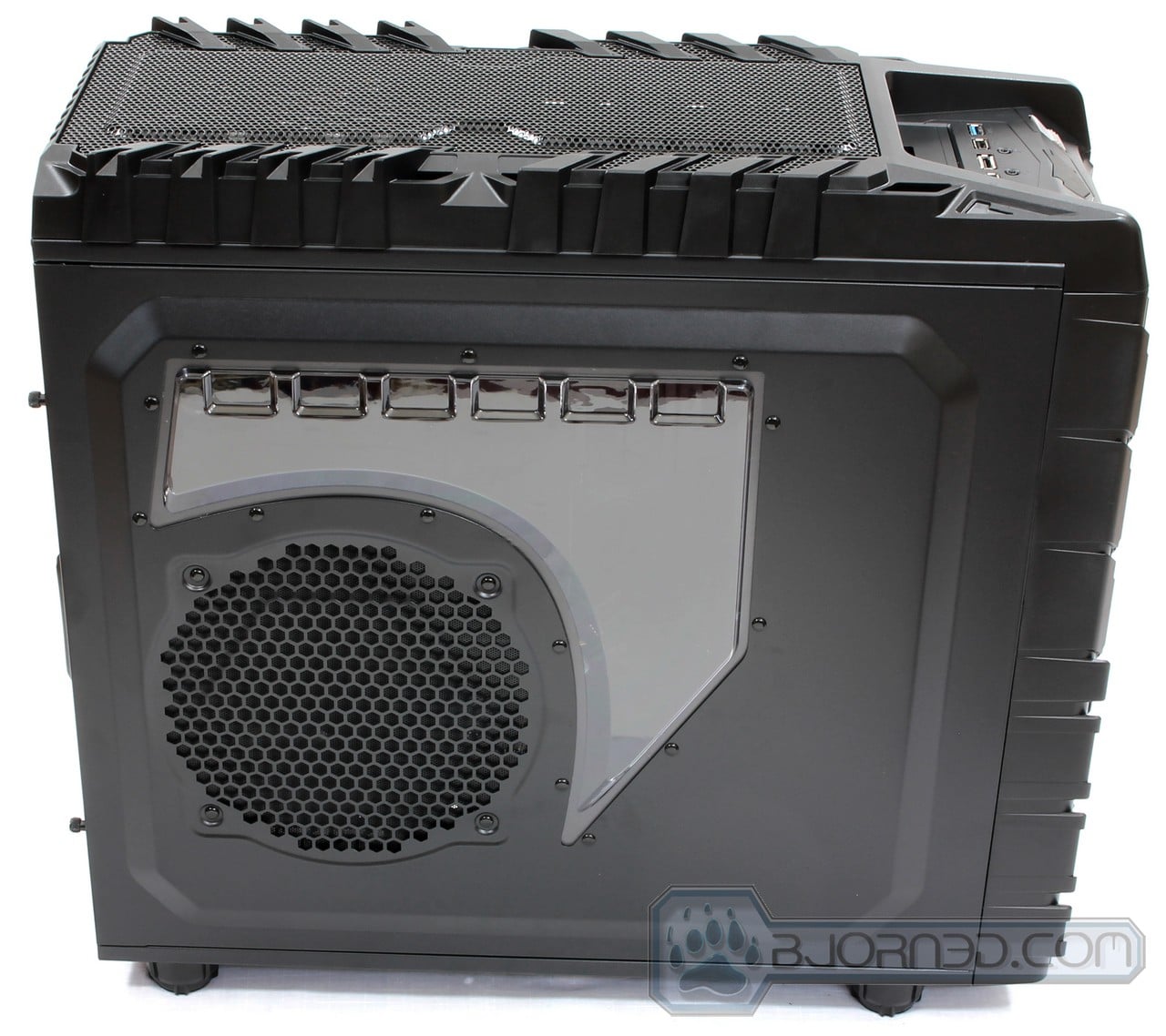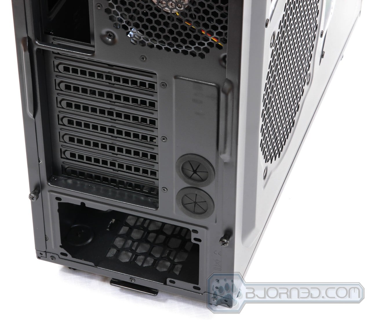 While not quite visible, the Overseer RX-I comes with circular feet that have rubberized bottom. This will prevent vibrations caused by fans and other hardware within the system.