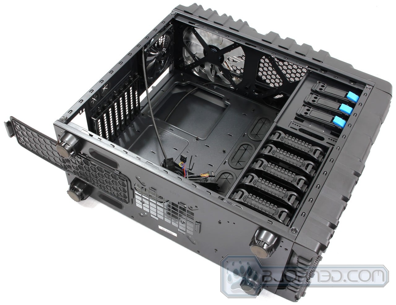 The tool-less 5.25″ drive bays are super easy to work with. once a DVD player is pushed in, it automatically snaps into place without having to readjust the position. It holds very tight, but additional screws can be installed to keep it in safe position. To remove the drive from the drive bay, all you have to do is push on the blue bar, and it will release the clips holding the drive in place.