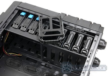 Here is a closer look at the drive bays available on the Overseer RX-I chassis. The three top slots are designated for 5.25″ drives, including a 4th one below the top three, which can also be used as a 3.5″ drive bay. Finally there are 5 other 3.5″ drive bays which can also be used as 2.5″ drive bays. Unfortunately only the top three 5.25″ drive bays are tool-less design, meaning that the other drive bays will require screws for proper installation.