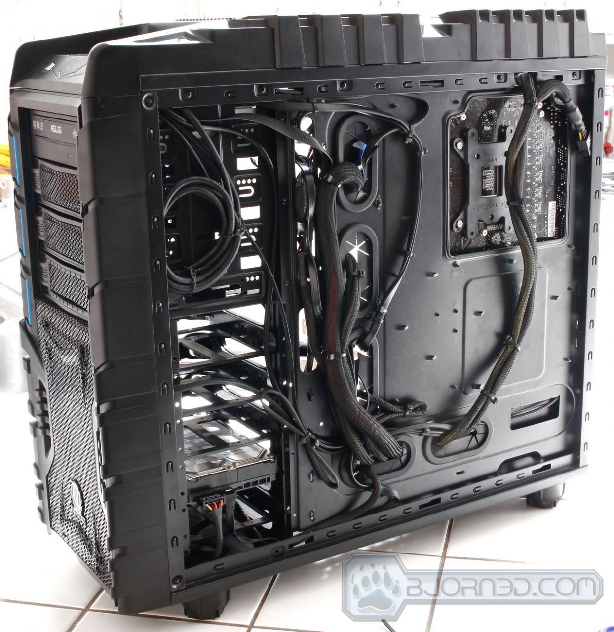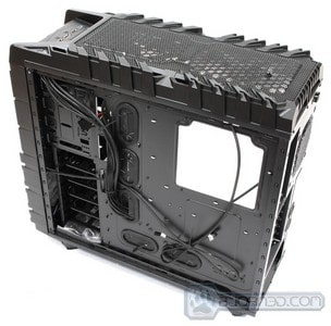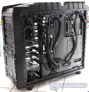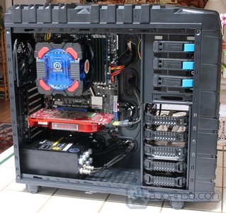 Here is our Sandy Bridge system running a Intel Core i7-2600K processor, and the ASUS P67 WS Revolution motherboard. We are using the Thermaltake Frio OCK CPU cooler to cool our processor and a 1300W power supply to power up the system. It might be an overkill but it allows us to upgrade the system with multiple video cards in the future without having to replace the power supply. Plus it serves us a good purpose of showing how large power supplies don’t have a problem fitting within the Overseer RX-I chassis. The back of the chassis shows the cable management we have done. We used zip ties to tie the cables to the motherboard tray, making it possible to easily close the case. The end result is a nice and clean system where cool air can circulate without any obstruction.