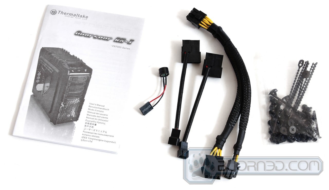 Some of the accessories that come with the Thermaltake Overseer RX-I includes a user’s manual, a Speaker for post or error reporting, two 3-pin fan header to Molex connector adapters, a 8-pin CPU extension cable or 4-pin CPU connector adapter, plenty of installation screws and cable management cable ties.