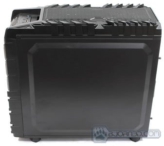 Both the right and left side panels come with a beveled and extruded design. This actually comes quite handy considering that an extruded side panel allows for more space for larger Air coolers while keeping that massive 200mm x 200mm x 30mm fan on the side panel. The right side panel’s extrusion helps with cable management. Many cases come with cable management holes, but unless you can really route your cables and make sure these cables don’t overlap too much, you’ll have a hard time closing your side panel. With the extrusion, there is extra space to route your cables, making it easy to snap back your right side panel even if you have a thick clutter of cables behind the motherboard tray. This is one excellent feature that we believe is essential in a well built chassis, and the Overseer RX-I has it.