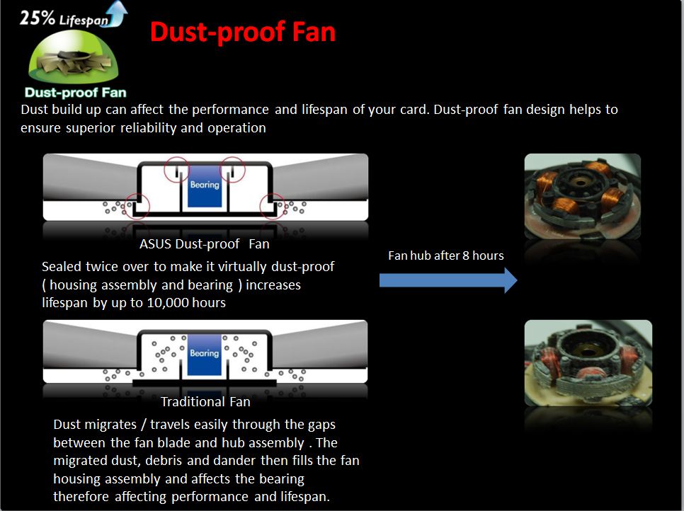Here you can see that the ASUS solution is not just sealing the hub from dust but having 2 levels of sealing which means that over the lifespan of the cooler you can expect a much lower likelihood that you will get the grinding or simply the failing that you normally get from the unprotected fan as seen above.