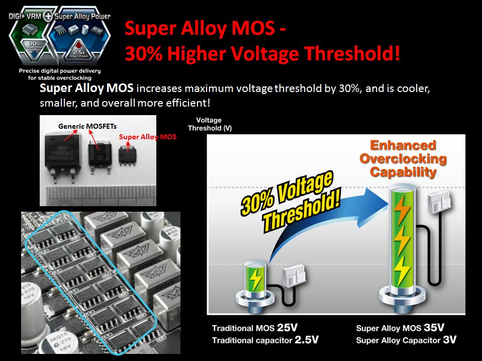 Here ASUS shows off its SAP selection for MOSFET components. These are designed to not only be more efficient but also have a higher power handling capability, which allows them to have extra head room for overclocking, should you really want to push the limit. Also note, the small package design of the SAP component as it is much smaller than the standard or generic MOSFET used on some standard or reference model cards. This allows for a larger VRM design to fit into a smaller space so that you can pack more punch without effecting the tight real estate within the chassis.