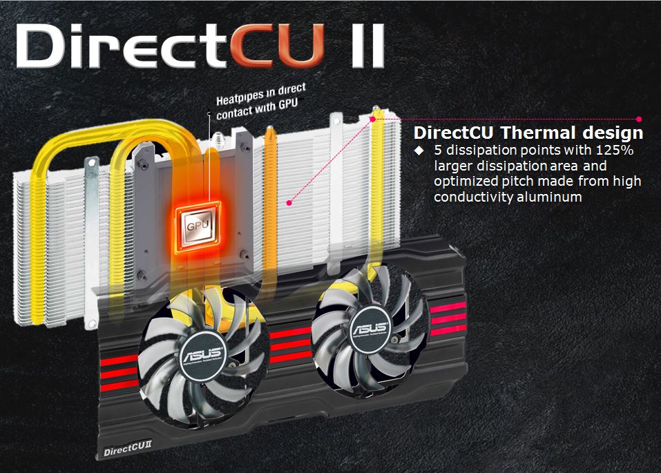 ASUS DirectCU II coolers are the ASUS way of saying maximum cooling and plenty of quiet with one naming scheme. DirectCU II coolers are direct touch heatpipes to the GPU surface, ensuring the heat is wicked away from the GPU and up into the cooling fin array as quickly as possible. From there, the custom shrouded dual fans push air through the fins effectively but most important quietly to keep the GPU as cool as possible so hopefully it will never hit a temp to need a higher or noisier fan speed. The air pushing through the fin array also helps cool board components and the VRM as well, which is a nice little added bonus to this style cooler since we all know cooler components tend to run stronger, longer and with better efficiency.
