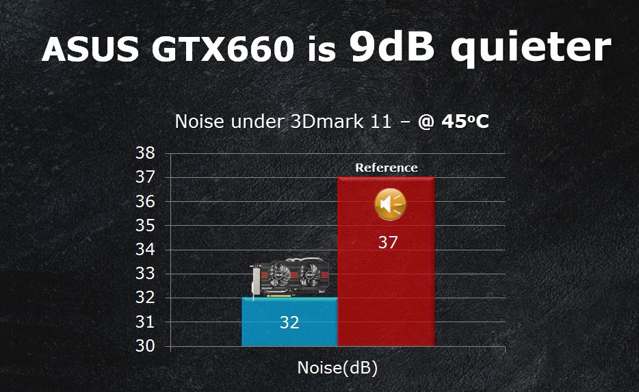 Here we can see that the DirectCU II cooler design with its dual fans is actually up to 5dB quieter than a reference design which is huge because dB unlike most measurements is huge steps for each dB in perceived loudness. So to see a 5dB drop is the difference between standing next to a bus and the bus being across a 4 lane street.