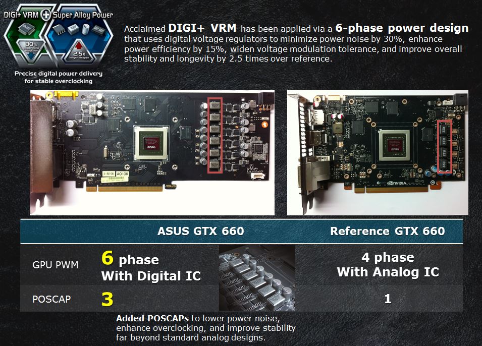 Here we see a comparison from a reference model GTX 660, which utilizes a 4 Phase analog design VRM with a single POSCAP in place. The DIGI+ version is a 6 Phase design with 3 POSCAPs to ensure no shortage of power or no conceivable way the GPU or components could be left wanting more under a heavy load situation. The Digital controller is one thing that many neglect to look at and with such control it is worth noting that there is no compromise for voltage accuracy and also efficiency as components are much more tightly regulated to ensure a solid and efficient VRM.