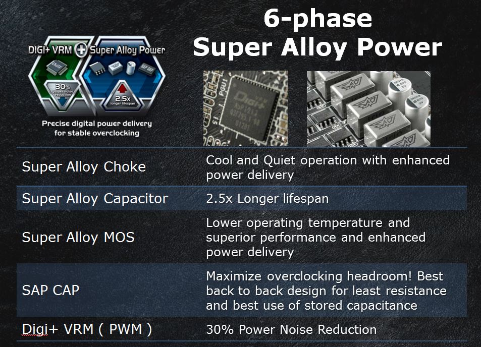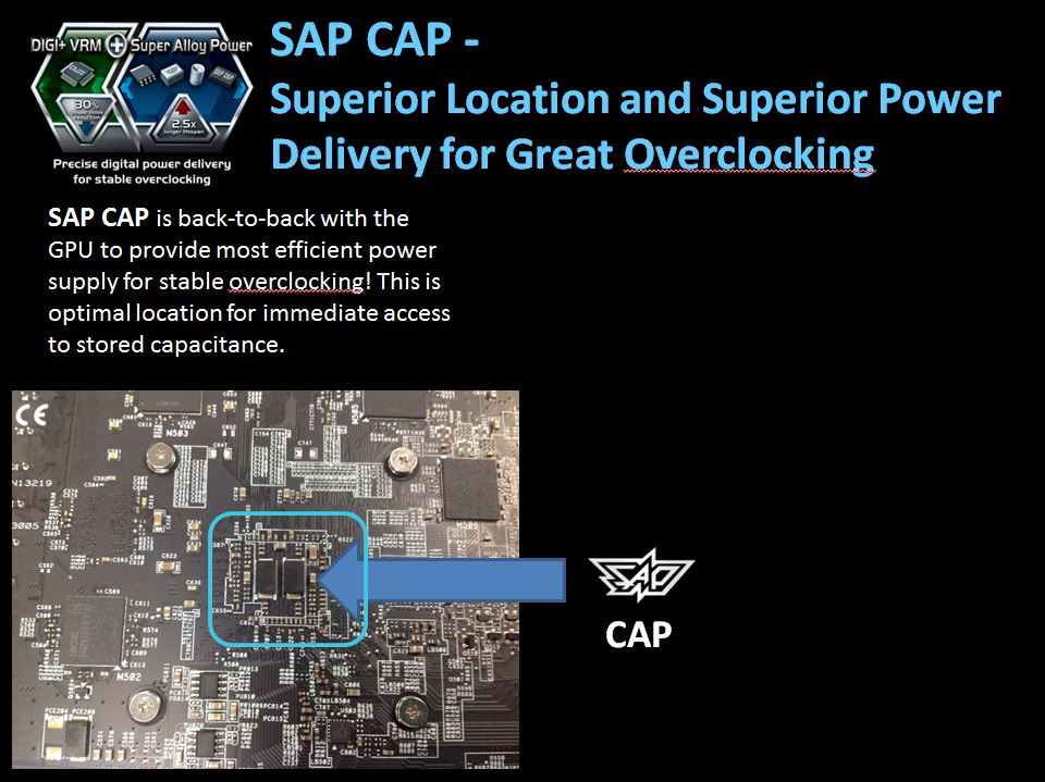 Here we see a short detailing of the SAP components and some short informational quips about how they help make for a better card. One thing here is that this is only the surface of what it is truly, as the SAP solution is a complete package of all of these components designed to work together giving not just higher power delivery than reference but also better voltage accuracy and efficiency through the digital voltage control and component selection and design.