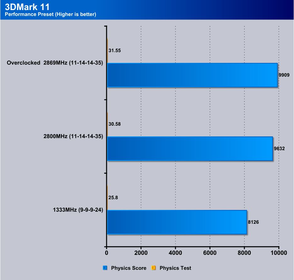 3DMark 11 is a nice synthetic benchmark which represents 3D gameplay. For this we am using the integrated HD4000 running at performance preset and I am only interested in the Physics score and test results. This is a CPU bound test and as you see the jump is quite nice from the small frequency boost when I overclocked it over the standard XMP Settings.