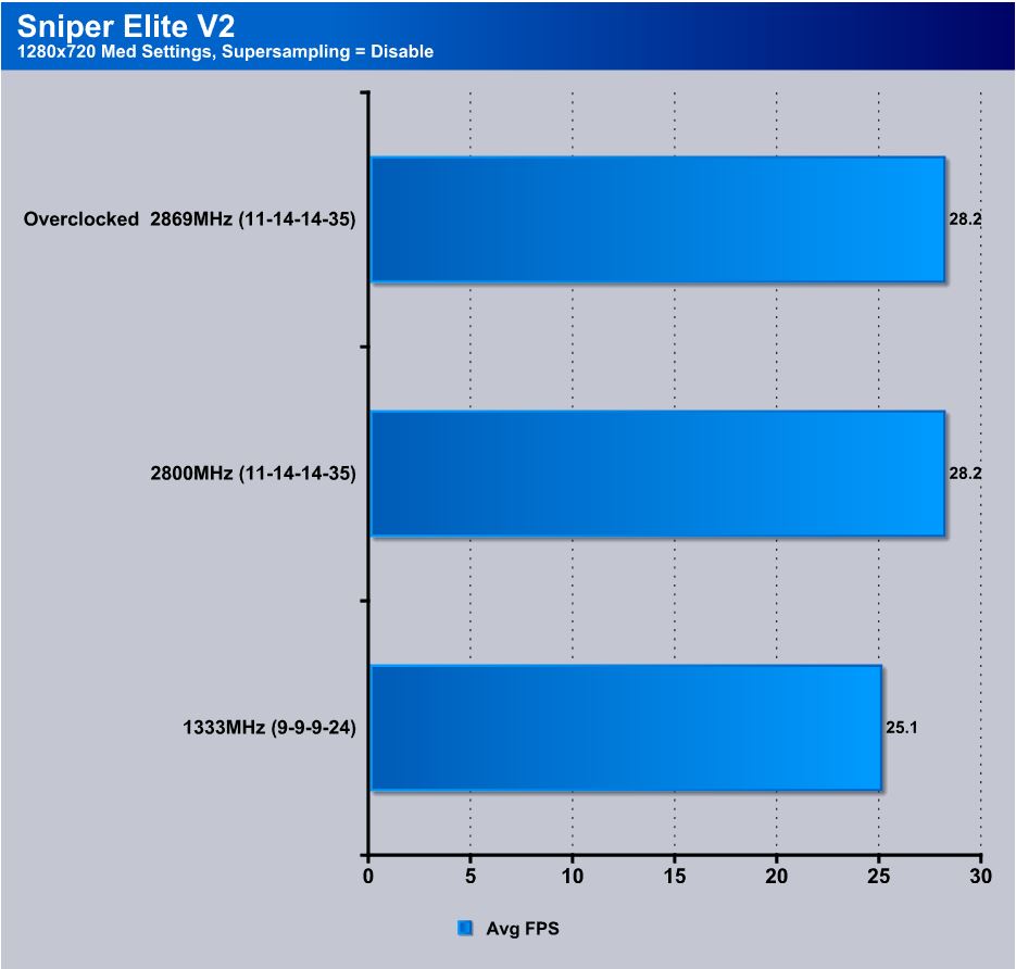 Sniper Elite V2 is a newer game we just recently added to my testing, so we went ahead and threw it in here just to see if it added any performance in real world gameplay. As you see here switching to XMP does make a difference and the FPS gain is quite good with a little over 3FPS gained just from a memory frequency change. Keep in mind that this is using the default integrated HD4000 GPU which also uses some of teh system memory and therefore will see a nice performance bump from the super speed modules.
