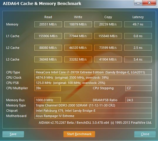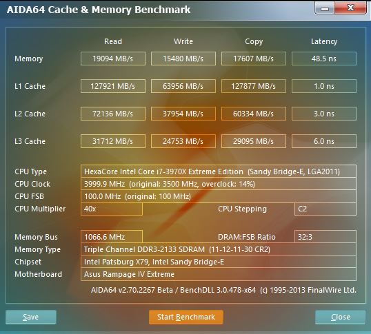 The results for the i7-3970X do not raise any eyebrows, as the performance increase is very small between the the stock i7-3960X and the i7-3970X. However, with an overclocked CPU, we start to see the benefits higher frequency memory modules. While the performance of the L1, L2, L3 cache has jumped quite a bit on the read, write and copy, we can see the same increase in performance on the memory as well. Do keep in mind that due to the increased CPU FSB, we had to lower the speed of our memory from 2133 MHz to 2000 MHz, while maintaining the same memory timings. Even with a slower memory frequency and same timings, the overall performance has jumped. By adjusting the timings according to the lower frequencies, we could technically achieve even higher performance.