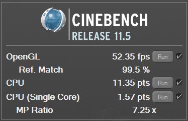 | Cinebench Release 11.5 | OpenGL | CPU (Multi) | CPU (Single) |