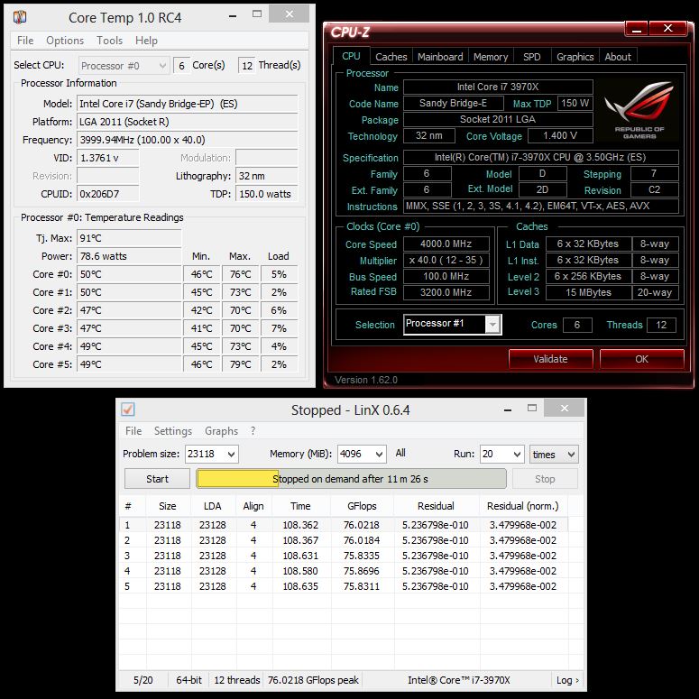 Finally, we went along and used LinX to do our overclocking stress testing, just like we have used it for our Temperature testing. At 4.75 GHz, the i7-3970X downclocked itself at full load on air. A more powerful cooling solution, such as Dual or Triple radiator water cooling system is necessary to keep the processor cool at such clock speeds. We did manage to boot our system without any issues and run it stably with our benchmarks at 5GHz without actually adjusting any voltage settings on the motherboard. This just shows us that the i7-3970X can handle whatever you throw at it as long as your running the processor in the right hardware.