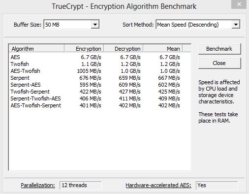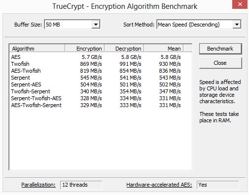 TrueCrypt is software for establishing and maintaining an on-the-fly-encrypted volume (data storage device). On-the-fly encryption means that data is automatically encrypted right before it is saved and decrypted right after it is loaded, without any user intervention. No data stored on an encrypted volume can be read (decrypted) without using the correct password/keyfile(s) or correct encryption keys. Truecrypt comes with a built in benchmark tool, which can give us a good idea of the processor encryption and decryption performance.