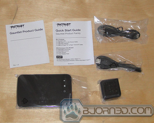 The packaging of the Patriot Gauntlet rips a page out of the high-end mobile devices. The Gauntlet comes in a thick box. On the outside is plenty of marketing information detailing the drive’s features such as support for Android and iOS devices, as well as the Amazon Kindle. Opening up the box, we can see the device sits on top of a partition with foam padding around it, again, reminiscent to how many smartphones are packaged. Underneath are the accessories. The unit comes with a Product Guide, Quick Start Guide, USB cable for charging, USB 3.0 cable, and a power brick. The charger that comes with the Gauntlet is rated for 2A of power at 5V or 10 watts. Keeping with the same mobile theme, the cable is attached to the charger via USB port and the other end plugs into the DC-in port on the device. We are surprised that Patriot did not go with an all USB design to charge the device so that there will be one power adapter to carry around if you ever need to take the Gauntlet with you.
