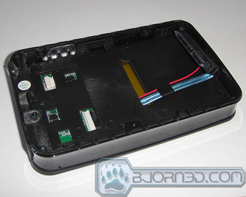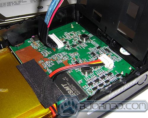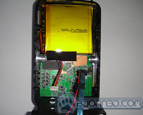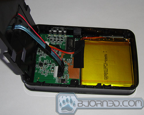When the hard drive is released from its connector, we can see that PCB and the battery are on a separate compartment The SATA power and data cable protrudes through the plastic divider to connect to the hard drive. The divider is simple to remove which gives us a clear view of the battery included. The Gauntlet comes with a 12.4W Lithium Ion polymer battery.