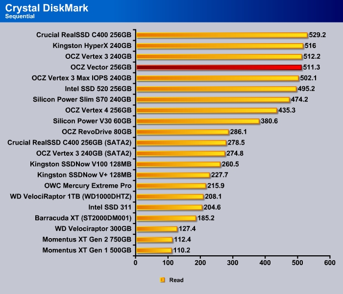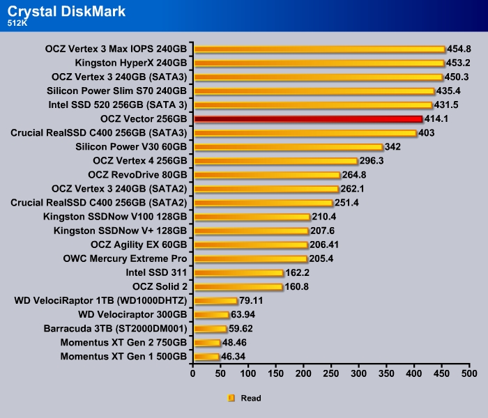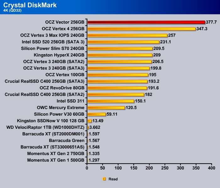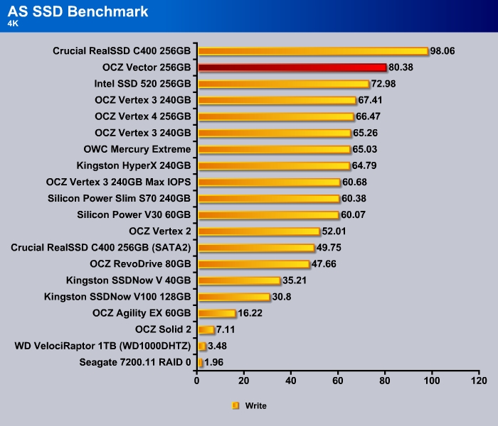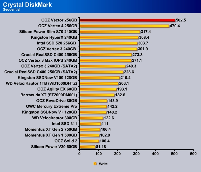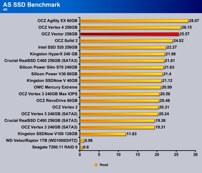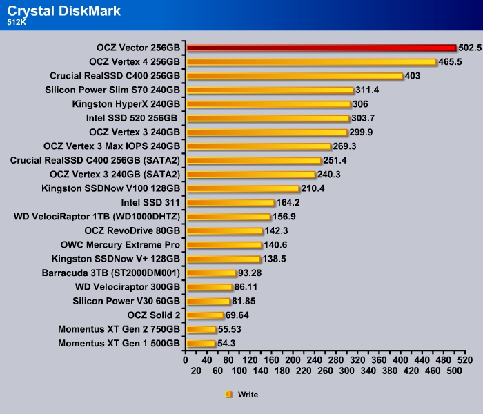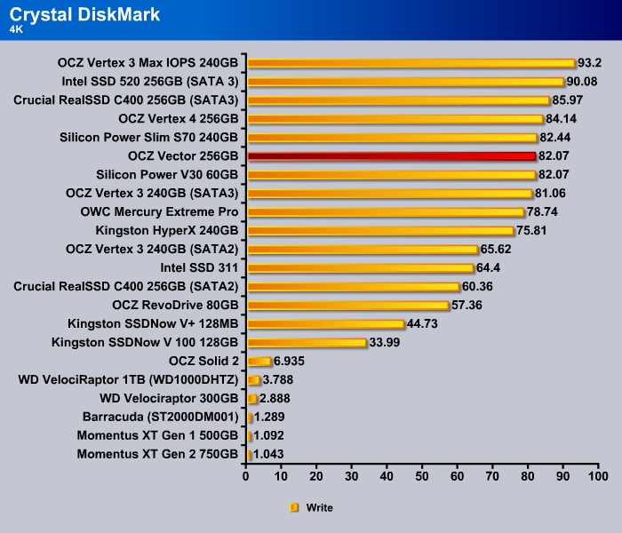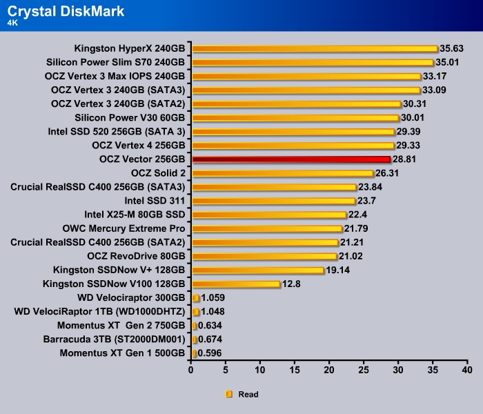 CrystalDiskMark shows the 4K random read and write of the Vector to be a tad slower than the Vertex 4 at 28.81 MB/s and 82.01 MB/s, respectively.