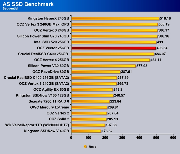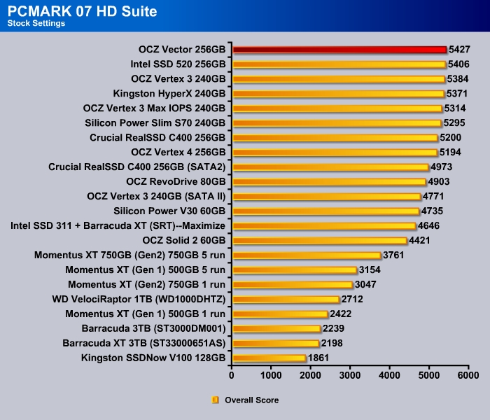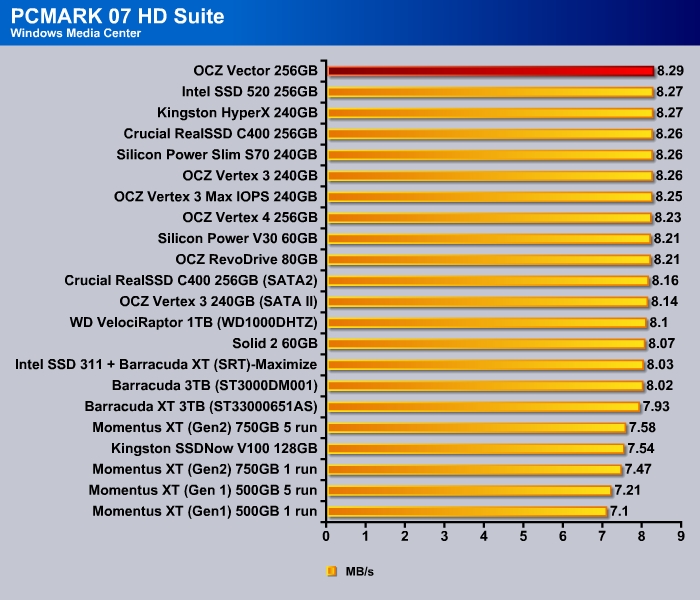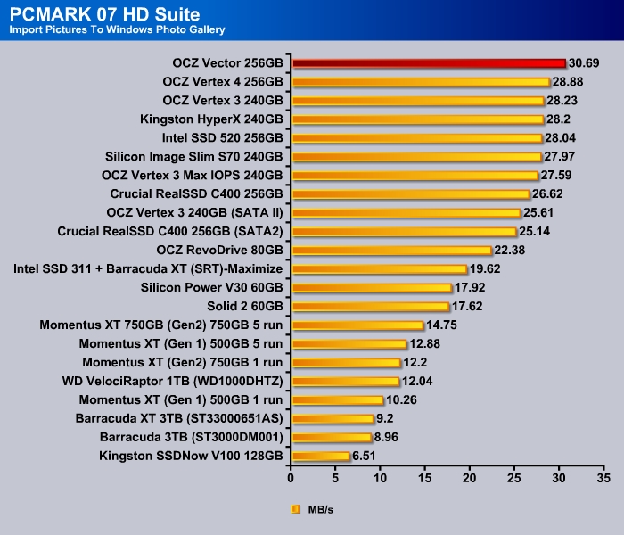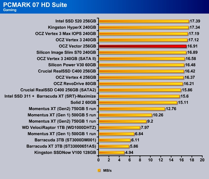 For typical desktop use, it would be hard to really tell the difference among most current crops of SSDs regardless of controller. Current SSDs are fast enough no matter the type of workload and it is often being limited rather not b the controller or the NAND device but rather the 6 Gbps interace on the SATA port. Nonethelss, the Vector is taking the top spot in the PCMark 7 storage benchmark, just edging out the Intel SSD 520.
