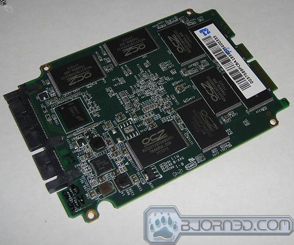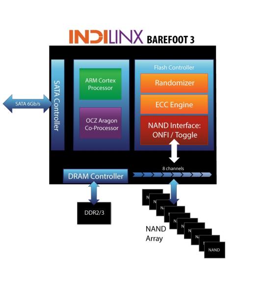 Looking at the block diagram, we can see that the Barefoot 3 controller is a bit unique that it is a dual processor that features a ARM Cortex controller and OCZ’S own Aragon co-processor. The controller has eight NAND channels with each channel capable of addressing up to eight flash dies. The controller supports ONFI or Toggle DDR standard. The Vector we have uses the Synchronous ONFI 2.2 for the best performance. It is very possible that in the near future we will see OCZ pairing the controller with different types of NAND for the Agility drives.