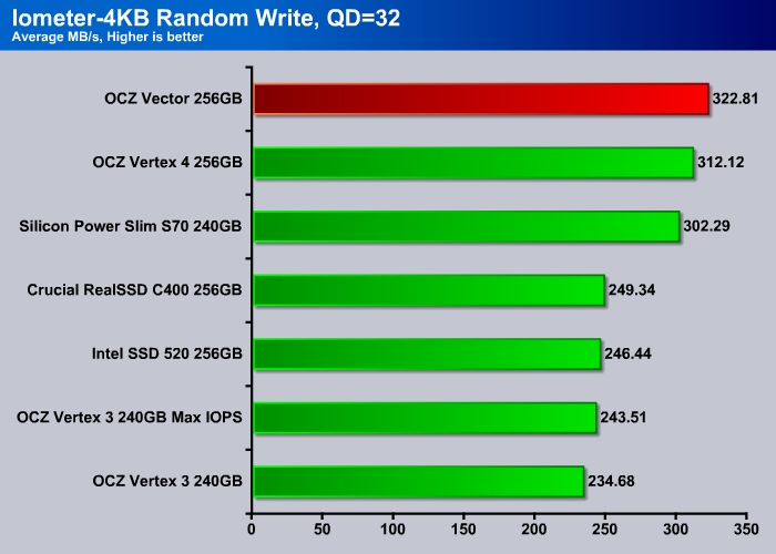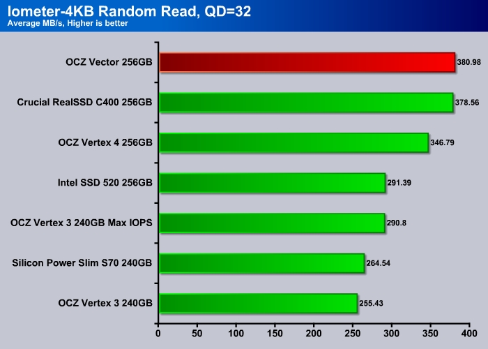 Cranking up the queue depth to 32 and the Vector still leads the pack with 380 MB/s. The Indilinx drives (Vertex 4 and Vector) were already faster than the SandForce drives when comes to high queue depth random read and OCZ is able to push it even further where the Vector shows about 10% improvement over the Vertex 4, putting it in the same league as the Crucial RealSSD.