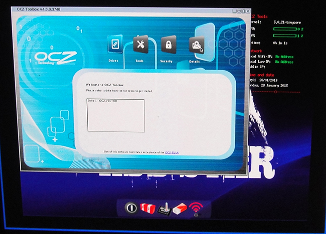OCZ provides a bootable OCZ Toolbox that users can download from the company’s website. The Toolbox provides the ability to update the drive’s firmware. A network connection is needed via either ethernet or wireless in order to download the firmware. The Toolbox also provides the ability to Secure Erase the drive. It also has the ability to display drive’s information as well as read the SMART values so that you can monitor the drive’s health.