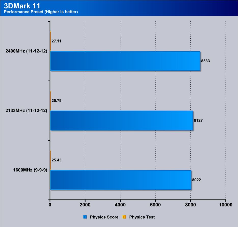 3DMark 11 is a nice synthetic benchmark which represents 3D gameplay. For this we are using the integrated HD4000 running at performance preset and we am only interested in the Physics score and test results. This is a CPU bound test and there is some gains seen by the increases of memory speed and also tightening up the timings where available.